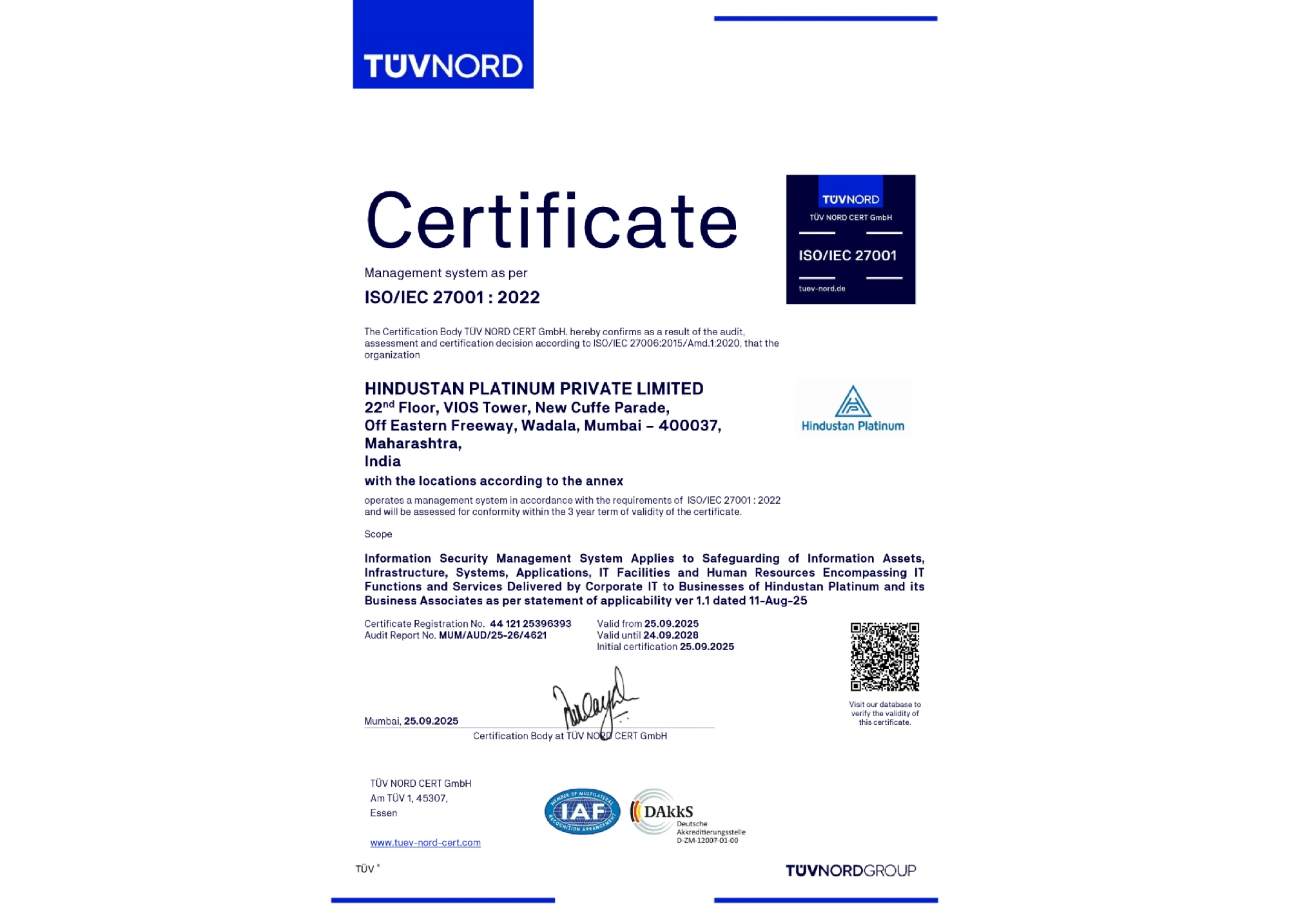 Hindustan Platinum is recognised as ‘Three Star Export House’, by Government of India; Ministry of Commerce & Industry; Department of Commerce; Directorate General of Foreign Trade.