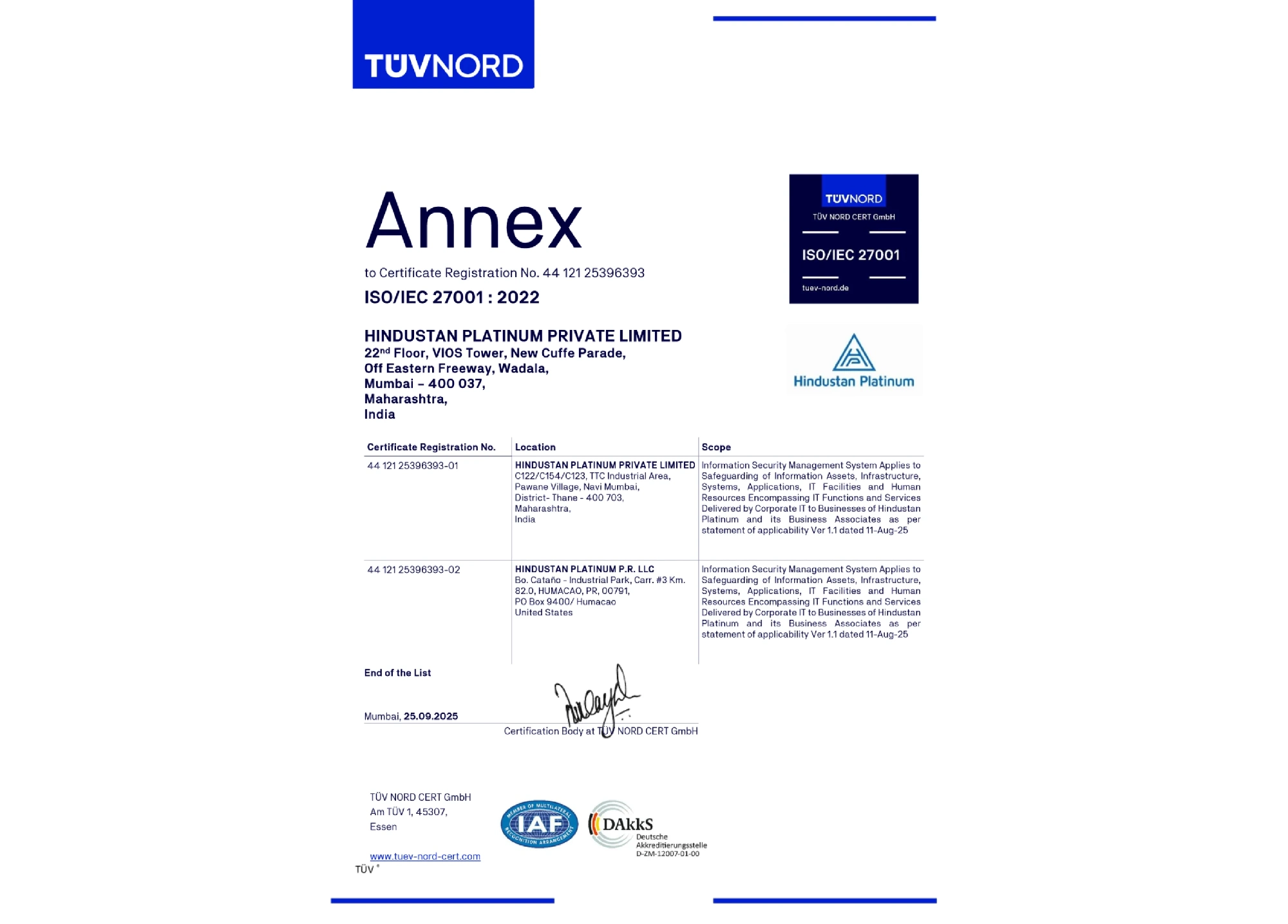 Hindustan Platinum’s Navi Mumbai refinery is on the London Platinum and Palladium Market (LPPM) Good Delivery List for Platinum and Palladium and on the London Bullion Market Association (LBMA) Good Delivery List for Silver.