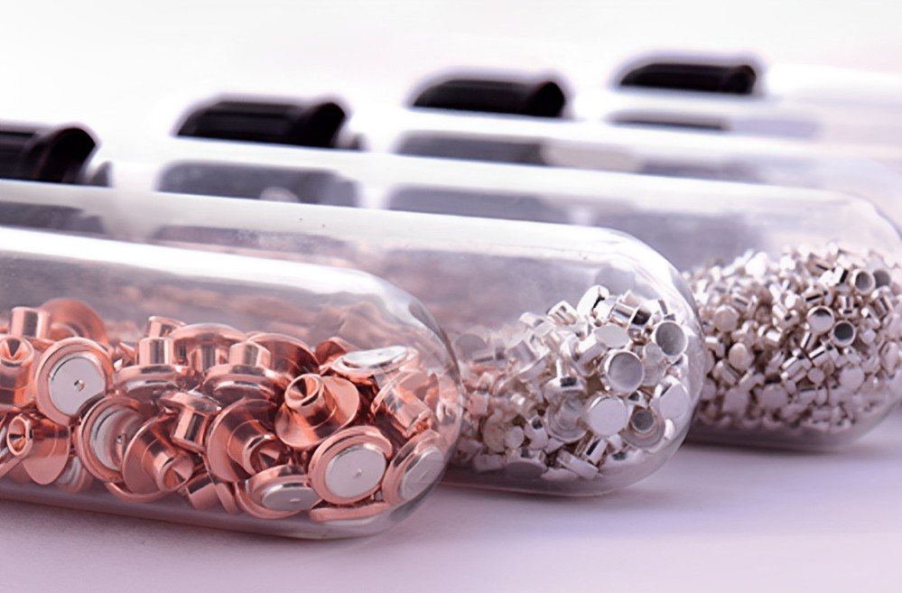 Tri-metal Rivets: Designed for dual-contact functionality, our tri-metal rivets integrate electrical contact layers on both sides, delivering enhanced reliability and significant cost savings. Ideal for double-headed moving contacts, these rivets provide superior electrical contact performance and long-term reliability.